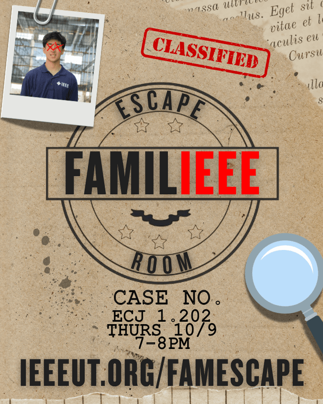 Are you ready for the 2nd fam-wide competition? Pull up with your fam to IEEE's FamilIEEE Escape Room Night! Work with your fam to solve puzzles and participate in minigames around the ECJ/EER area. As always, there will be plenty of fam points on the line 🤑 Not in a fam but would still like to participate? No problem! All are welcome.